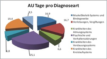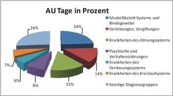 Die Verteilung der AU-Tage im Jahr 2005 zeigen, wo für Unternehmen Handlungsbedarf besteht: Spitzenreiter mit 24,2 Prozent aller AU-Tage waren die Erkrankungen des Muskel-Skelett-Systems und des Bindegewebes. Das ist nahezu ein Viertel aller Erkrankungen. Sinnvoll wäre es daher, Arbeitsplätze verstärkt unter ergonomischen Gesichtspunkten zu überprüfen. Erwünschter Nebeneffekt: Ein rationelleres und damit wirtschaftlicheres Arbeiten. So rechnen sich die erforderlichen Investitionen überraschend schnell.